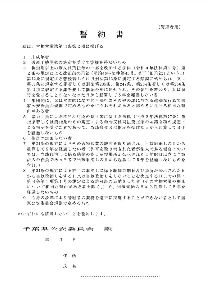 古物商許可を申請しようとする、個人や会社の役員、管理者が欠格要件のどれにも該当していないことが求められます。